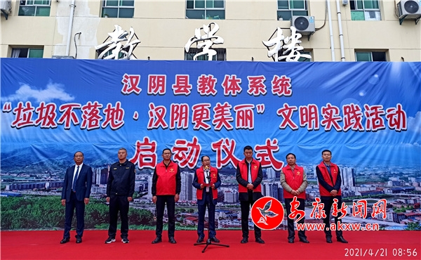 本網(wǎng)訊(通訊員 蘭本波 李永濤)為扎實推進干凈、暢通、宜居、文化“四個城市”建設(shè),打造干凈、整潔、文明的衛(wèi)生環(huán)境,提升廣大師生文明素質(zhì),4月21日,漢陰縣教體系統(tǒng)舉行“垃圾不落地·漢陰更美麗”文明實踐活動啟動儀式。漢陰縣政府副縣長劉濟兵出席活動,漢陰縣委宣傳部、縣教體科技局、縣創(chuàng)建辦、縣城管執(zhí)法大隊、城關(guān)鎮(zhèn)分管領(lǐng)導(dǎo)和城區(qū)中小學(xué)及幼兒園主要負責(zé)人及漢陰縣初級中學(xué)全體師生2400余人參加活動。