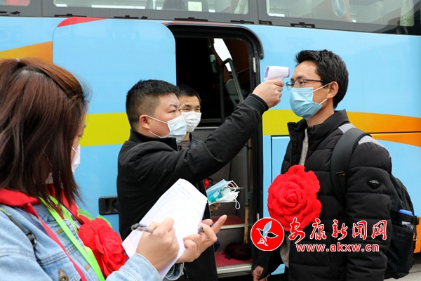 記者在現(xiàn)場(chǎng)看到,前來(lái)乘車(chē)的務(wù)工人員都戴了口罩,而且在上車(chē)之后,醫(yī)護(hù)人員還逐一量了體溫,以確保每位人員身體健康。“前期我們?cè)趯?duì)農(nóng)村勞動(dòng)力摸排過(guò)程中,首先是向他們宣傳疫情防控的知識(shí),對(duì)有外出務(wù)工需求的人員,我們會(huì)對(duì)其進(jìn)行體檢,幫助他們完善身體健康的證明資料。今天在現(xiàn)場(chǎng)又進(jìn)行一次體檢,同時(shí)車(chē)上還有專(zhuān)門(mén)工作人員每隔4小時(shí)為他們量體溫,以此來(lái)確保輸出務(wù)工人員的健康安全。” 漢濱區(qū)人力資源和社會(huì)保障局負(fù)責(zé)人魏東鵬介紹。
