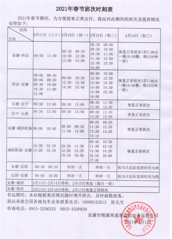 2021年春節(jié)期間,為方便旅客正常出行,安康高客站大巴班次將作出以下調(diào)整:n8a安康新聞網(wǎng)