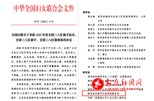 本網訊(通訊員 李倩)“三八”國際勞動婦女節(jié)前夕,全國婦聯(lián)表彰了一批全國三八紅旗手標兵、全國三八紅旗手和三八紅旗集體。安康市行政審批服務局榜上有名,作為全省六個、全市唯一的單位,榮獲“全國三八紅旗集體”榮譽稱號。