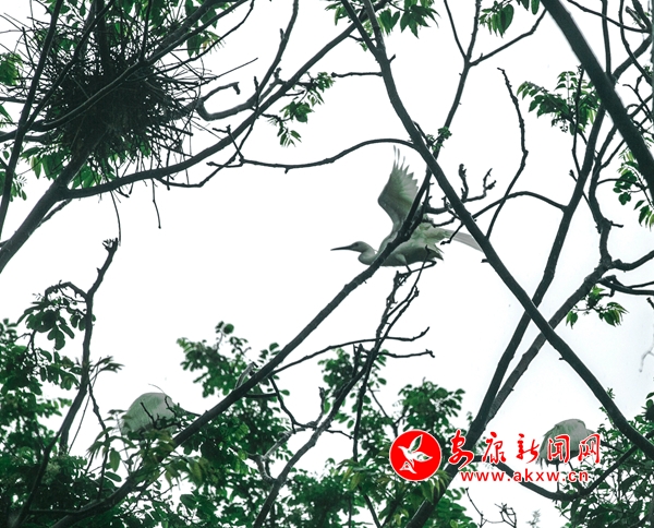 本網(wǎng)訊(記者 潘潤生 實習(xí)記者 安。┰诮ㄔO(shè)中的高新區(qū)新時代大道施工現(xiàn)場,遠遠望去,有一片“突兀”的小樹林,林中有30多個鳥窩,大量白鷺在樹叢中引吭、飛舞。4月23日,大雨滂沱,記者在接到線索趕到這里時,就立刻被這雨中雪白的精靈震撼、吸引。