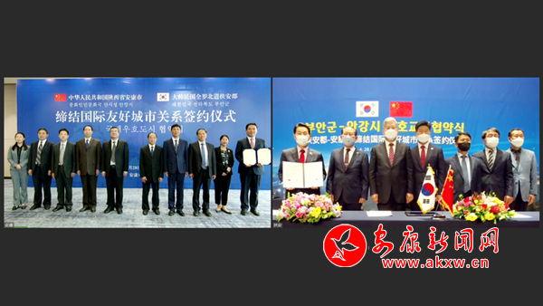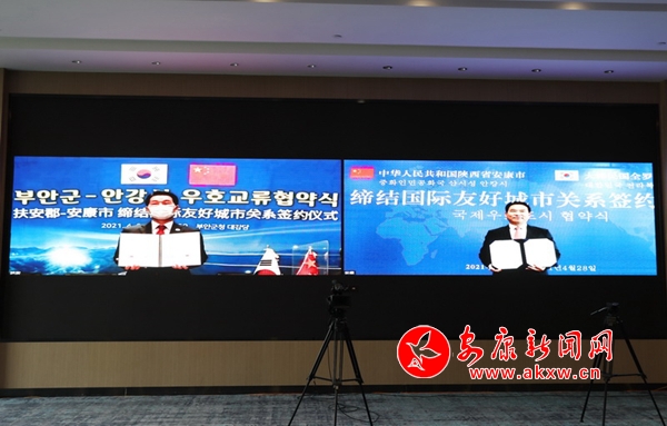 本網(wǎng)訊(記者 艾蓓 通訊員 梁石)4月28日,“中華人民共和國陜西省安康市和大韓民國全羅北道扶安郡締結(jié)國際友好城市關(guān)系簽約儀式”通過互聯(lián)網(wǎng)線上舉行,兩地正式簽署建立國際友好城市關(guān)系協(xié)議書。市長趙俊民、市人大常委會副主任周永鑫、市政府秘書長陳伍文,扶安郡郡守權(quán)翼鉉、扶安郡議會議長文燦奇等嘉賓分別在兩地出席簽約儀式,中國駐韓國光州總領(lǐng)事張承剛應(yīng)邀參加活動。