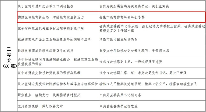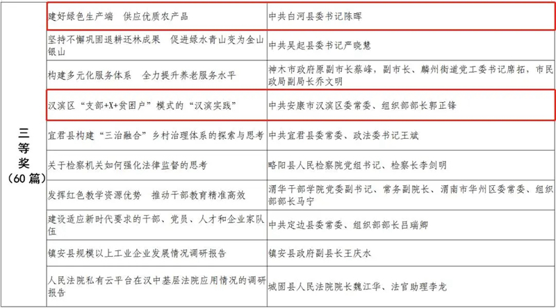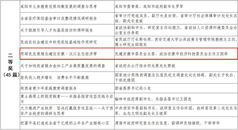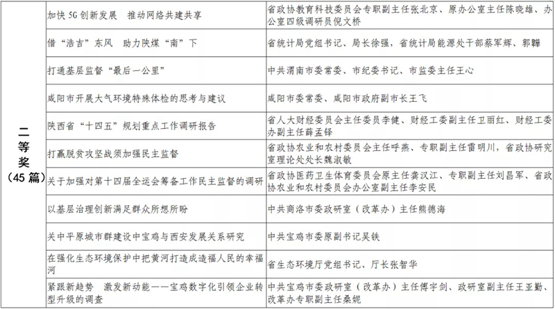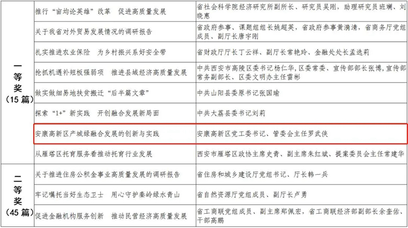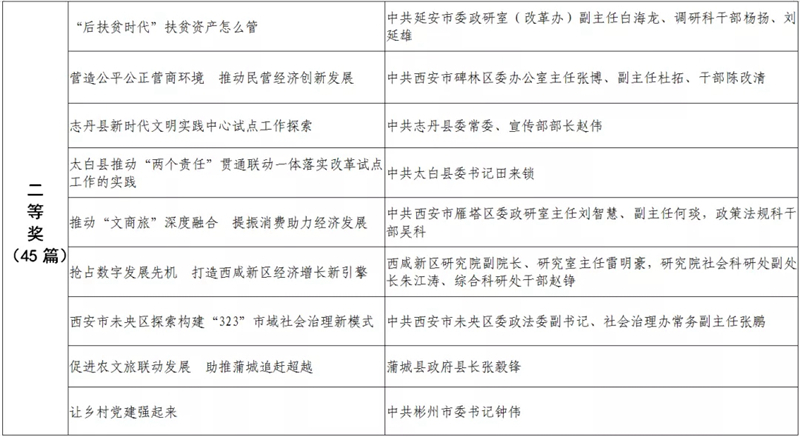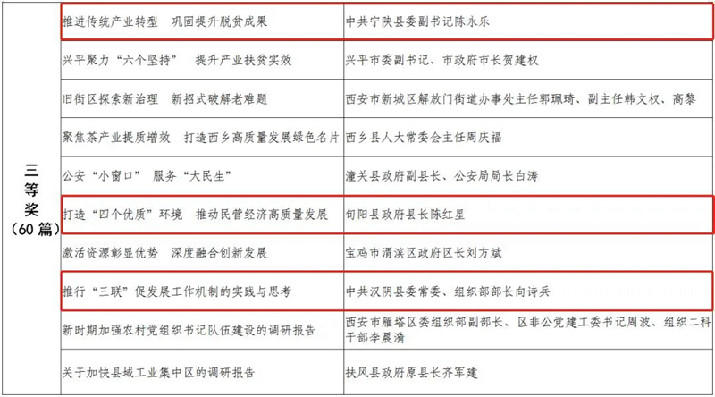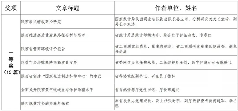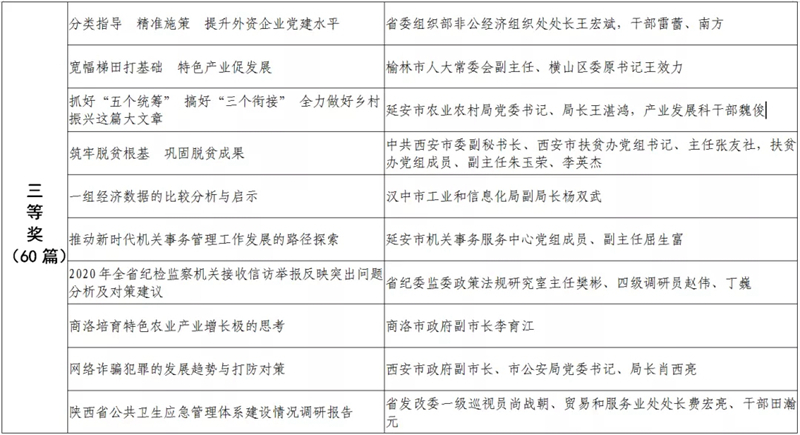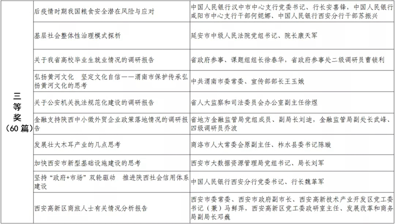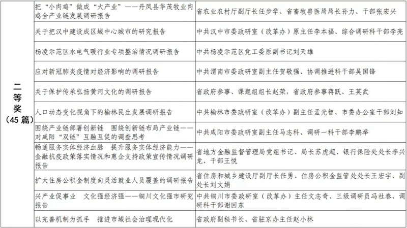 據(jù)悉,全省黨政領(lǐng)導干部優(yōu)秀調(diào)研成果評選工作迄今已開展了18年。本次評選活動從全省市縣兩級和省級各部門上報的487篇縣處級以上黨政領(lǐng)導干部調(diào)研報告中,評出獲獎優(yōu)秀調(diào)研成果120篇。其中,《陜西農(nóng)民增收路徑研究》等15篇獲一等獎,《關(guān)于推進住房公積金事業(yè)高質(zhì)量發(fā)展的調(diào)研報告》等45篇獲二等獎,《后疫情時期我國糧食安全潛在風險與應(yīng)對》等60篇獲三等獎。