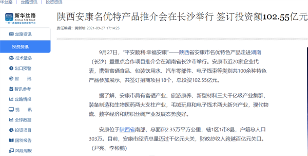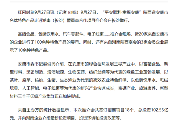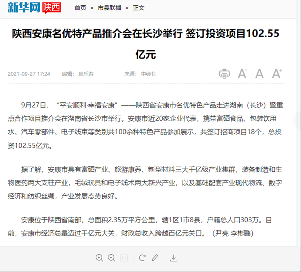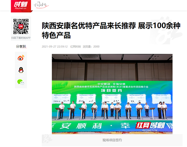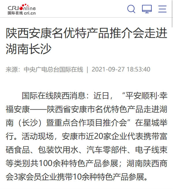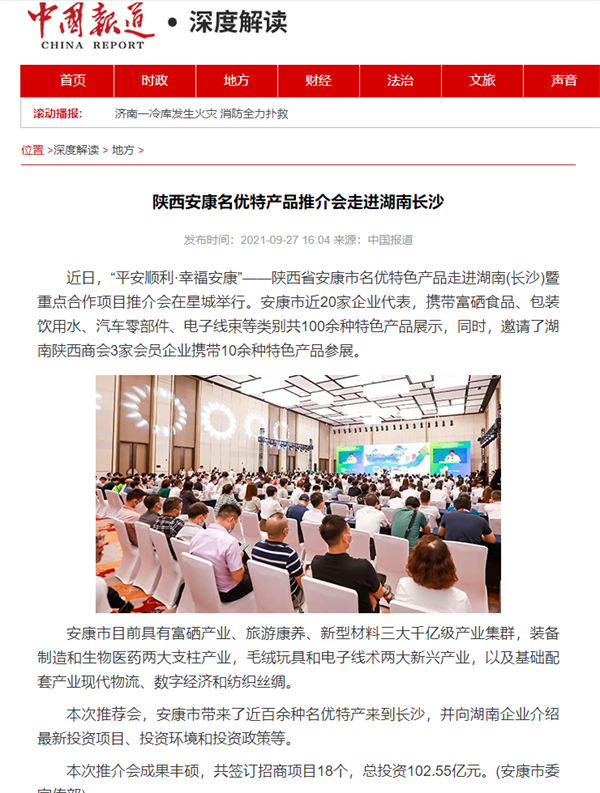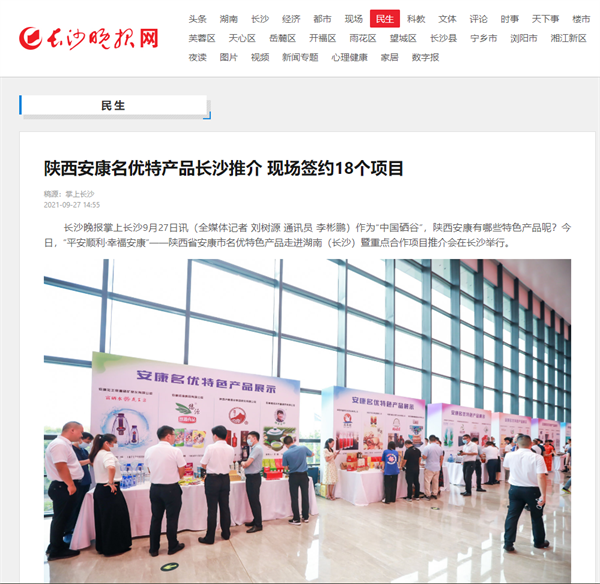 本網(wǎng)訊 9月27日,由中共安康市委、安康市人民政府,陜西省商務(wù)廳聯(lián)合主辦的“平安順利·幸福安康——陜西省安康市名優(yōu)特色產(chǎn)品走進(jìn)湖南(長(zhǎng)沙)暨重點(diǎn)合作項(xiàng)目推介會(huì)”在長(zhǎng)沙市成功舉辦。新華社、中國(guó)交通廣播、中國(guó)報(bào)道、湖南日?qǐng)?bào)、長(zhǎng)沙晚報(bào)、三湘都市報(bào)、國(guó)際在線、紅網(wǎng)等中省、長(zhǎng)沙以及駐長(zhǎng)多家媒體紛紛給予報(bào)道。媒體不僅高度贊揚(yáng)兩地的合作成果,并對(duì)安康有了一個(gè)嶄新的評(píng)價(jià)和認(rèn)識(shí)。一起看看“老親戚”長(zhǎng)沙眼中的“老鄰居”安康是什么樣!