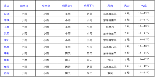 預(yù)計今天晚上到明天白天小雨轉(zhuǎn)陰天;明晚到9日陰天間多云,西北部陰轉(zhuǎn)小雨;10日小雨轉(zhuǎn)陰天;11日陰天;12日多云轉(zhuǎn)晴;13日晴間多云;14日晴轉(zhuǎn)多云。3QZ安康新聞網(wǎng)
