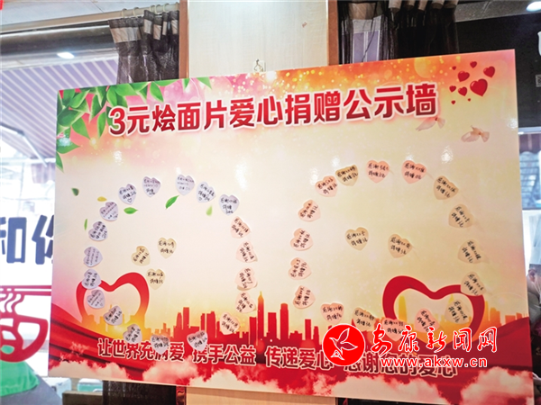 “感謝XX蕊捐款10元,感謝馬遠鵬律師捐款20元,感謝XX默為環(huán)衛(wèi)工人認購燴面片10份捐款30元,感謝山茶花捐款80元,感謝XX娃捐款300元……”大廳西墻壁新設(shè)置的“愛心捐款公示墻”上,貼滿了連日來通過微信、現(xiàn)金等方式,認購燴面片的愛心人士的昵稱和捐款金額。