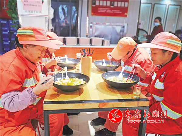 十幾年前,向美玉從湖南遠嫁至安康,幾年前加入了“城市美容師”的行列,負責清掃城區(qū)高井加油站附近的街面,平日起早貪黑,緊趕慢趕,區(qū)域內(nèi)衛(wèi)生才能保持干凈。如果中途回家吃個飯,就太耽誤時間了。得知天源飯莊為環(huán)衛(wèi)工人準備了熱氣騰騰的燴面片,她便和同事一起過來就餐。“冬天能吃一碗美味的燴面片,我們心里暖暖的,感謝老板和愛心人士對我們的關(guān)愛。”向美玉說。