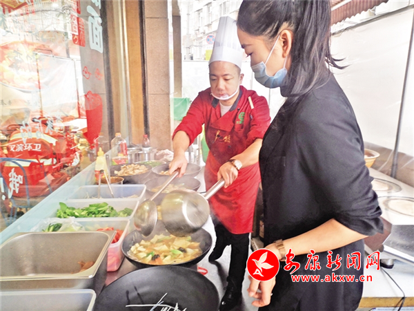 店外操作間,兩位廚師忙碌地烹調(diào)著香味四溢的燴面片。操作臺上一口口大碗中,被廚師逐個放入粉條、木耳、黃花菜……少頃,熱氣騰騰的燴面片就端到環(huán)衛(wèi)工人面前,環(huán)衛(wèi)工人被凍紅的臉頰泛起了笑容。