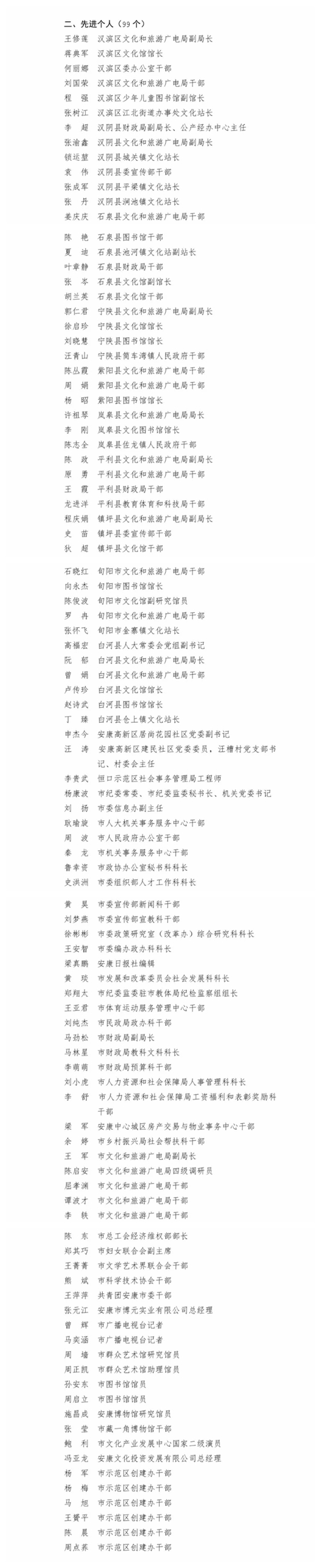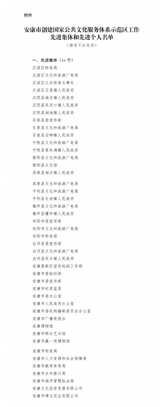 近日,中共安康市委、安康市人民政府下發(fā)了《關(guān)于表彰創(chuàng)建國家公共文化服務(wù)體系示范區(qū)工作先進(jìn)集體和先進(jìn)個人的決定》,具體內(nèi)容如下:
