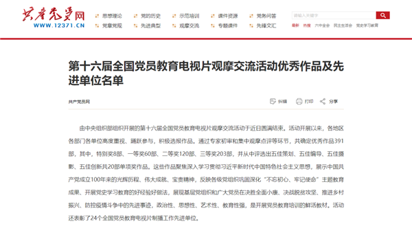 由中央組織部組織開展的第十六屆全國黨員教育電視片觀摩交流活動(dòng)近日?qǐng)A滿結(jié)束,全國共391部?jī)?yōu)秀作品和24個(gè)先進(jìn)單位獲獎(jiǎng)。Rii安康新聞網(wǎng)