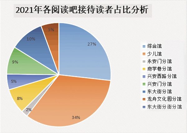 2021年,接待人數(shù)最多的閱讀場館也是少兒館,接待人數(shù)147188人次,占全年接待讀者總?cè)藬?shù)的34%。借閱排行榜的前20名均為少兒圖書,其中楊紅櫻所著《笑貓日記·藍色的兔耳朵草》全年借閱次數(shù)達到97次。這表明,隨著雙減政策的落地和少兒閱讀積分存折、親子閱讀等少兒閱讀推廣活動的開展,極大地調(diào)動了少兒群體的閱讀積極性,圖書館正逐漸成為學(xué)生群體課余生活的新選擇。