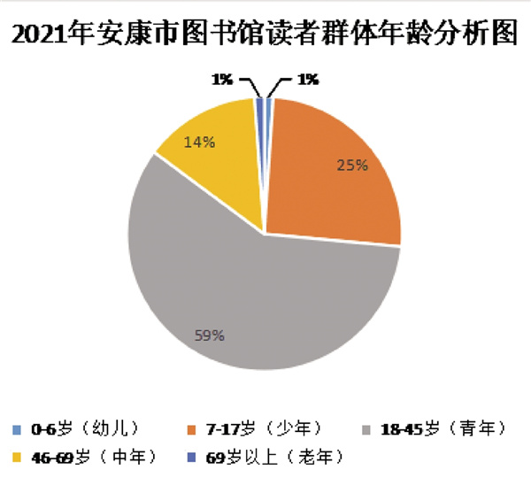 從讀者年齡段來看,市圖書館2021年有幼兒讀者(0-6歲)324人,少兒讀者(7-17歲)8098人,青年讀者(18-45歲)18686人,中年讀者(45-69歲)4347人,老年讀者(69歲以上)366人。讀者群體中青年讀者占比最大,占讀者群體的59%。少年讀者和青年讀者仍是圖書館的主要服務(wù)對象,總占比達到84%。