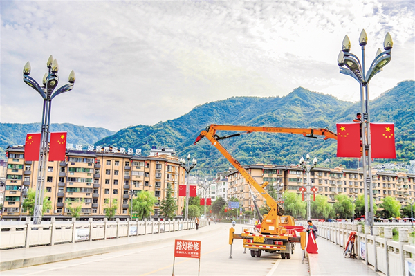 9月25日,紫陽縣城區(qū)橋溝路的大道上,工人正在懸掛國(guó)旗。