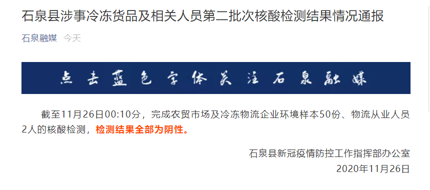 本網(wǎng)訊 11月26日,石泉縣新冠疫情防控工作指揮部辦公室發(fā)布《石泉縣涉事冷凍貨品及相關(guān)人員第二批次核酸檢測結(jié)果情況通報(bào)》。通報(bào)顯示,截至11月26日00:10分,完……