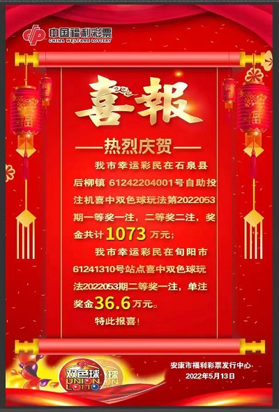 據(jù)檢索,一等獎中出站點位于石泉縣后柳鎮(zhèn)三角路口可明商店61242204001號自助投注機。這張彩票是12日下午購買的,購彩者當(dāng)時花費6元購買了一張6+3的自選小復(fù)式彩票,攬獲一等獎1注1000萬元,二等獎2注共73萬元,獎金合計1073萬元。另一個中出二等獎的福彩站點位于旬陽市華聲大廈61241310號投注站,獲獎彩民購買的是一張14元的7+1的復(fù)式自選彩票,喜中二等獎1注36.6萬元。