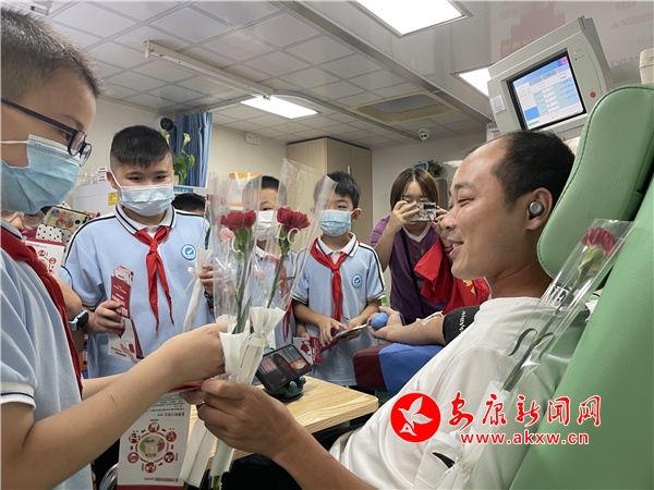 隨后,在采血車內(nèi),醫(yī)務(wù)人員從血液成分、獻(xiàn)血條件、獻(xiàn)血流程等方面為孩子們現(xiàn)場(chǎng)講解。孩子們?yōu)橹驹刚攉I(xiàn)花,表達(dá)敬意。