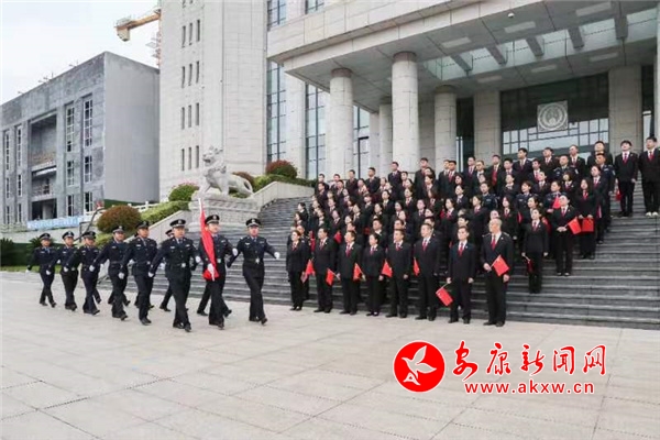 上午8時(shí),升旗儀式正式開(kāi)始,全體干警在辦公樓前整齊列隊(duì)。司法警察組成的國(guó)旗護(hù)衛(wèi)隊(duì)英姿颯爽,邁著堅(jiān)定而整齊的步伐,護(hù)衛(wèi)五星紅旗行至升旗臺(tái)。鮮艷的五星紅旗伴隨著雄壯的國(guó)歌聲冉冉升起,迎風(fēng)飄揚(yáng)。全院干警肅穆而立,滿(mǎn)懷崇敬之情向國(guó)旗行注目禮,表達(dá)對(duì)祖國(guó)的無(wú)限忠誠(chéng)與熱愛(ài)和忠誠(chéng)履行審判職責(zé)的堅(jiān)定信念。