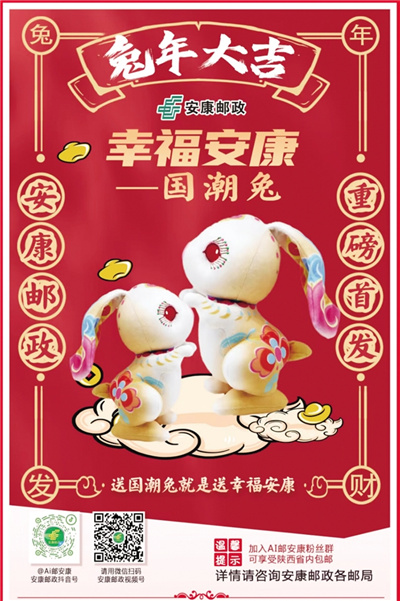 目前該產(chǎn)品有四款規(guī)格:12厘米的鑰匙扣(包掛或車掛);25厘米手辦禮物玩偶;45厘米中型玩偶;65厘米收藏級玩偶。為滿足更多的群眾需求,安康郵政打通內(nèi)外部平臺,搭建線上線下銷售渠道,線下在郵政各網(wǎng)點(diǎn)、合作單位宣傳展示;線上通過京東商城、Ai郵安康抖音等全面推廣。結(jié)合即將來臨的春節(jié)氛圍營造,安康郵政各營業(yè)網(wǎng)點(diǎn)特別布置了“玉兔呈祥·幸福安康”打卡專區(qū),供喜愛國潮毛絨玩具的廣大群眾打卡留念,為癸卯年新春的到來新增了更多喜慶祥和的氛圍。