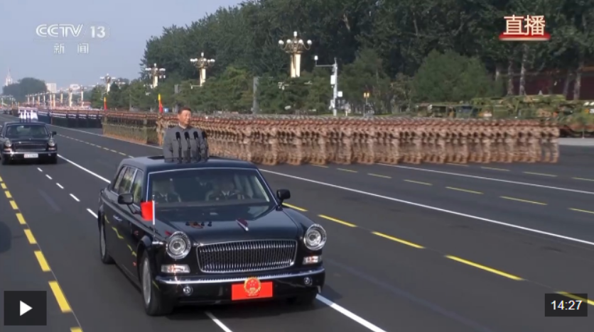 在雄壯的軍樂(lè)聲中,習(xí)近平乘車(chē)沿著寬闊的長(zhǎng)安街,依次檢閱徒步方隊(duì)和裝備方隊(duì)。